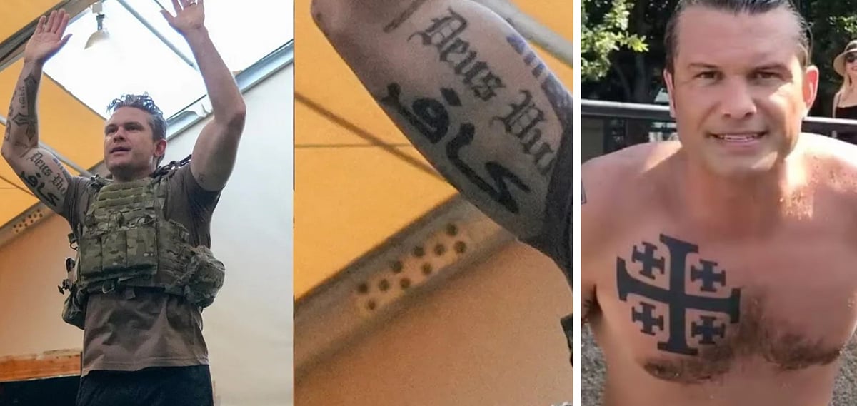 ট্রাম্পের প্রতিরক্ষামন্ত্রী এই হেগসেথের সারা গায়ে ট্যাটু। পশ্চিমা দুনিয়ায় শরীরে ট্যাটু করা বা উলকি আঁকা খুবই সাধারণ ব্যাপার; কিন্তু হেগসেথের গায়ে যেসব উলকি আঁকা, তা গা শিউরে ওঠার মতো।